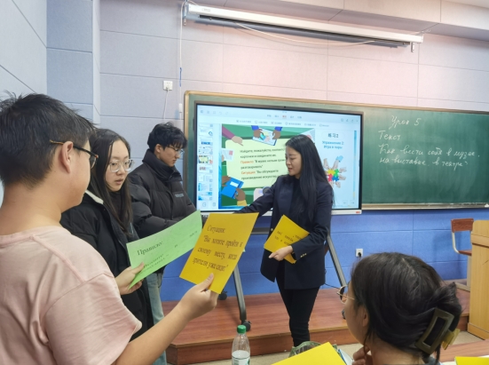 此次观摩由曹诺和李希卢两位老师主讲。曹诺老师讲授课程为《俄语实践3》第五课课文,她通过词汇的导入,引出了中国的“礼”,课文中重点词汇的讲解让学生更好地掌握积极词汇的用法,并以生动的教学范例和实践中的对话情境帮助学生们将课文中国情知识应用到实际生活中,激发了学生们对俄语学习的兴趣和动力。